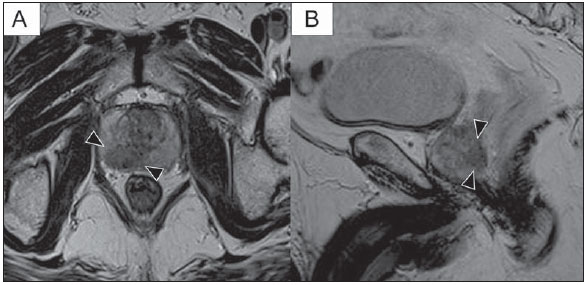 Acima, podemos observar um aspecto típico de tumor na zona periférica, em imagens pesadas em T2, mostrando uma lesão nodular hipointensa no T2 à direita, marcada com cabeças de seta nos planos axial (A) e sagital (B).