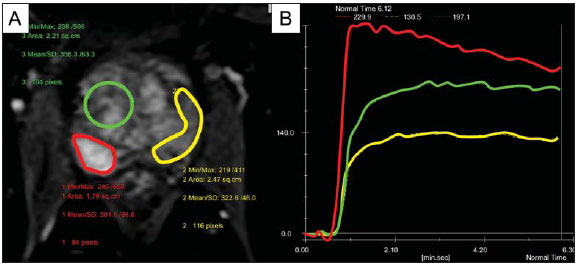 Na imagem acima, vemos representada a curva de intensidade de sinal versus tempo, numa lesão tumoral típica. A imagem A representa a fase arterial precoce na avaliação, mostrando uma área focal de realce precoce na zona periférica à direita (marcada pela linha vermelha). Áreas normais também foram demarcadas na zona periférica contralateral (em amarelo) e na glândula interna (em verde). As curvas resultantes, na imagem B, mostram que a lesão suspeita (curva vermelha) é caracterizada por uma subida intensa e íngreme (wash-in), seguida por uma queda significativa (wash-out), com um comportamento significativamente distinto das outras curvas.